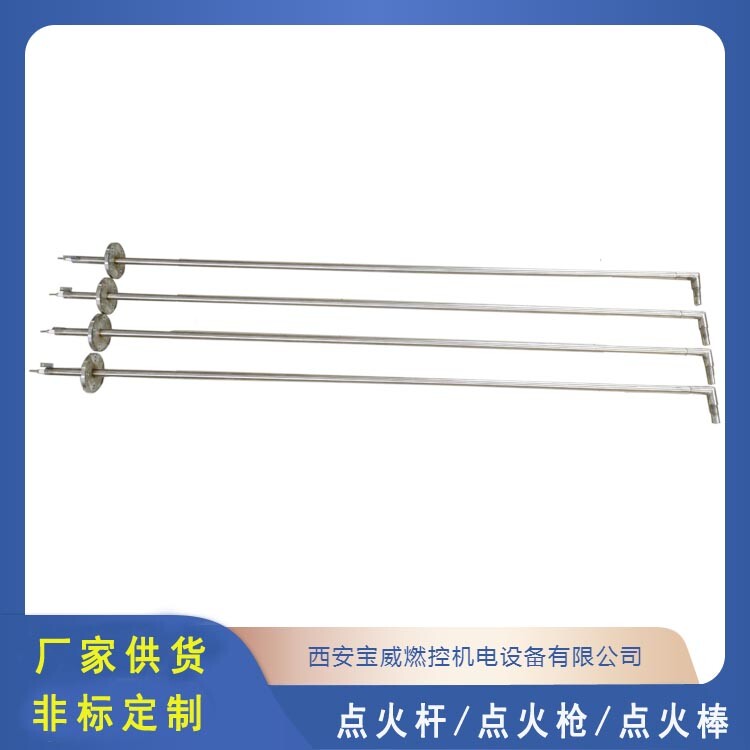 点火杆/高能点火枪/点火棒与高能点火器箱体、高压点火电缆组成一整套高能点火器,点火棒发火端瞬时耐高温1300℃,材质2520 导电杆材质304,点火棒长度、形式可根据要求非标定制。点火棒使用寿命20万次,采用半导体沿面放电火花能量大,而且点火时不需要调整点火距离。