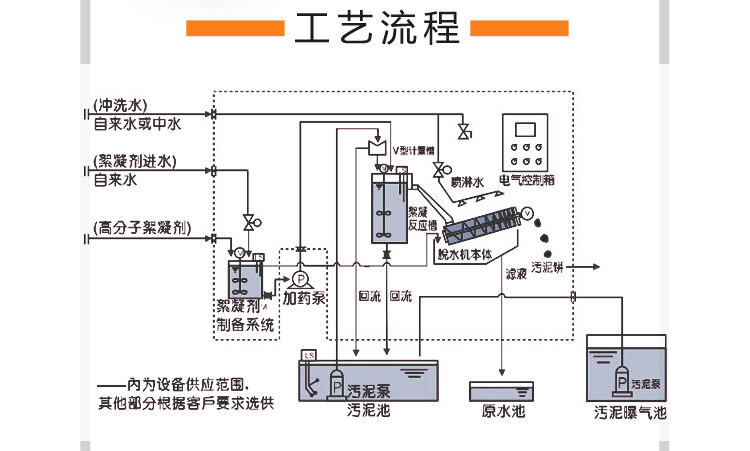 2、电控柜、絮凝混合槽和脱水主体一体化,减少占地面积,安装起来简单方便。