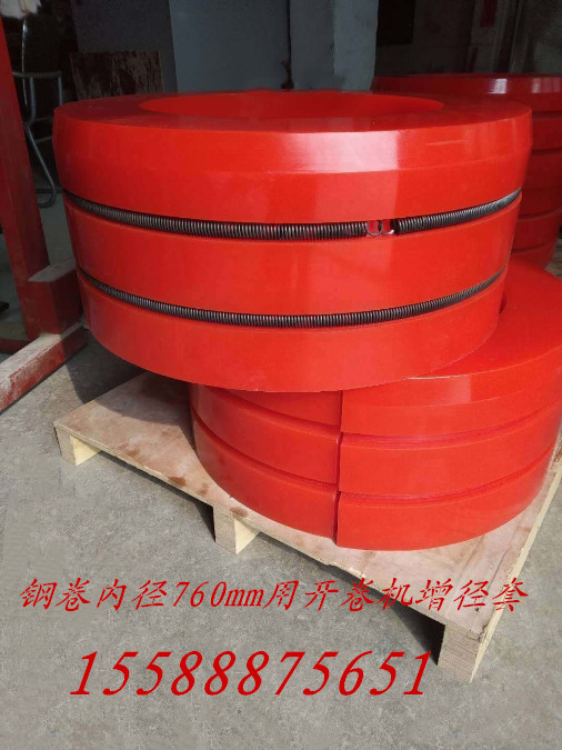 我公司供应钢卷内径610mm、730mm、760mm用开卷机增径胶套,宽度可根据客户需要定制,产品规格!所采用的聚氨酯材质,使增径套具有较高的机械强度和氧化稳定性,耐磨性佳,回弹性好!