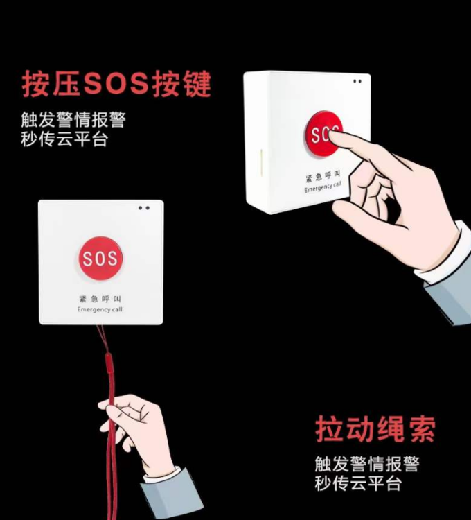 4GCat1版本紧急按钮,免充电,寿命可用2年以上,方便换电池,信号好,4G的网络,按钮和拉绳两种触发方式,医院,居家养老都试用,一键求救,电话短信多种方式通知,紧急求救