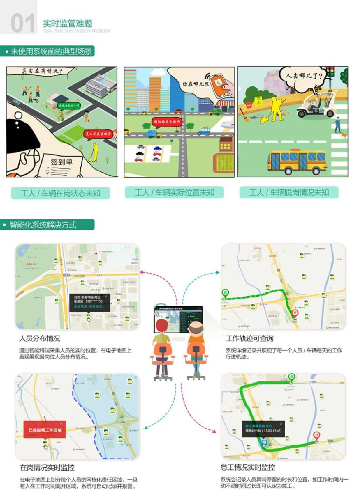 - 实时监管 (人员分布情况、工作轨迹查询、在岗情况监控等)