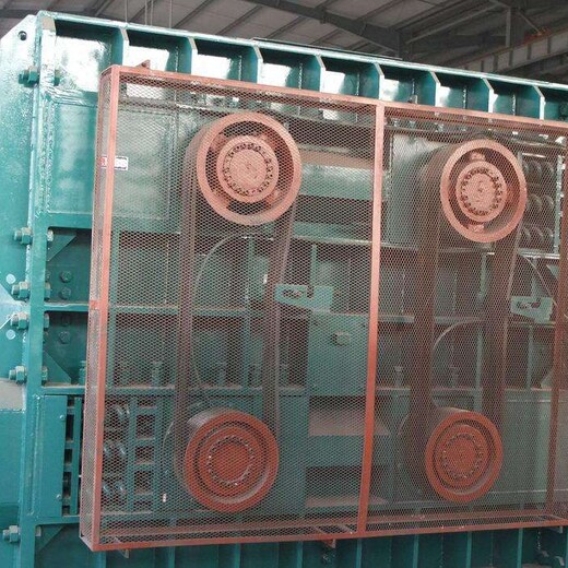 齿辊破碎机由2个电动机经过皮带传动使一、二两级工作齿辊相对运动。当物料由布料装置进入齿辊工作区的时候辊上齿板相互交错啮入物料,对物料进行挤压、劈裂、拉、克服物料质点间内聚力、断裂破碎,使物料从300mm破碎到50mm以下并随之进入二级齿辊工作区,二级齿板会对其作进一步破碎,使粒度由50mm破碎到10mm以下。破碎机两级工作辊齿相互交错,充分利用剪、劈、折、拉等对物料组合破碎;在破碎过程中物料还会不断翻滚寻找脆弱的方位进行选择性破碎;破碎只针对大块的物料,达到或细于要求的小料直接从辊齿间隙通过,不增加过粉量。