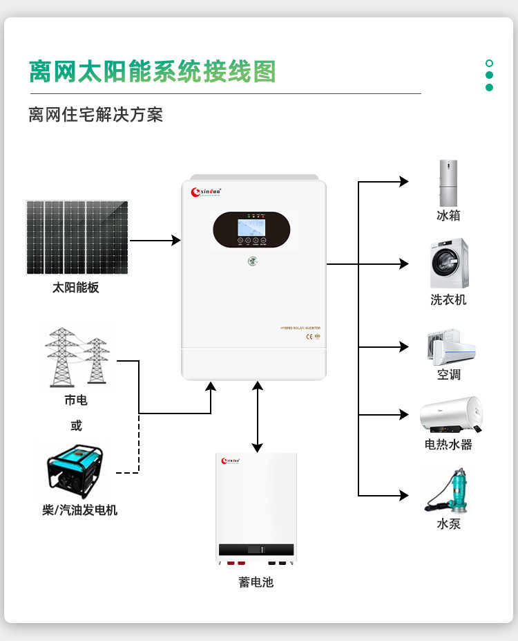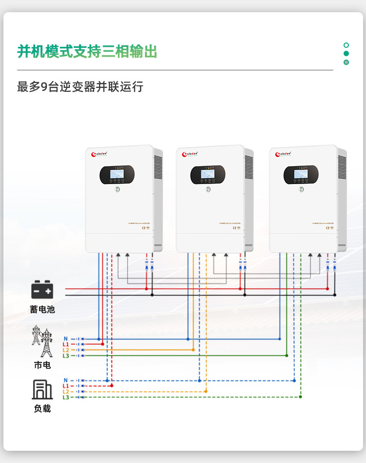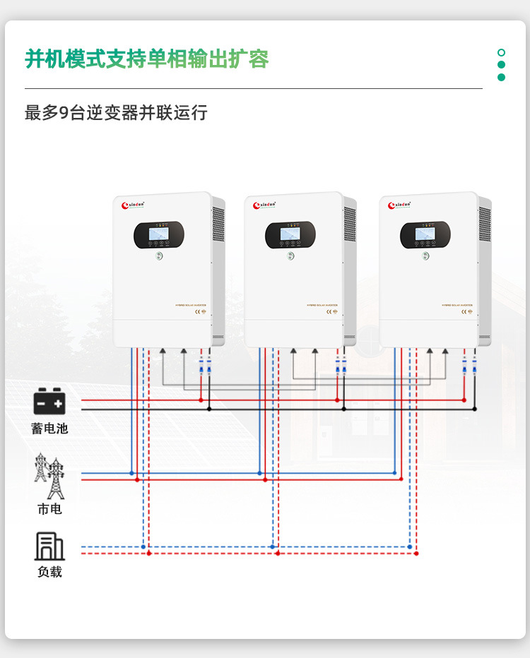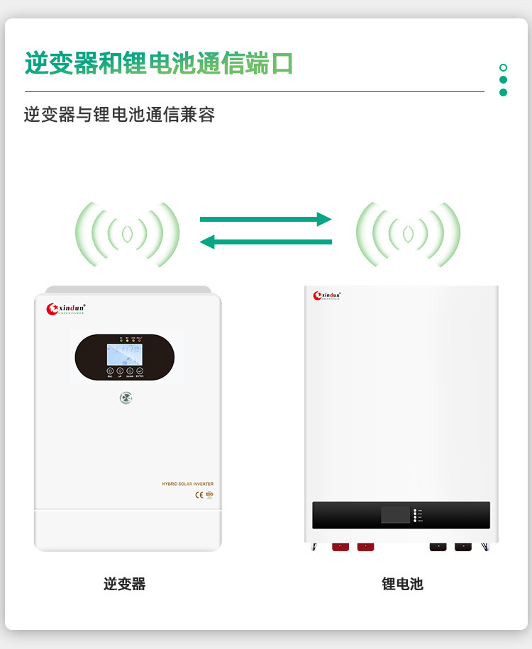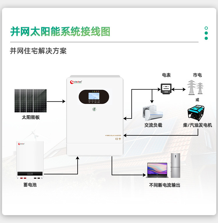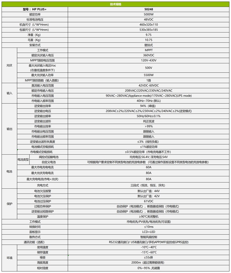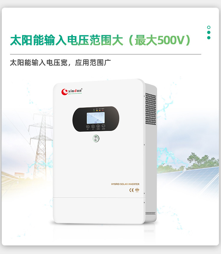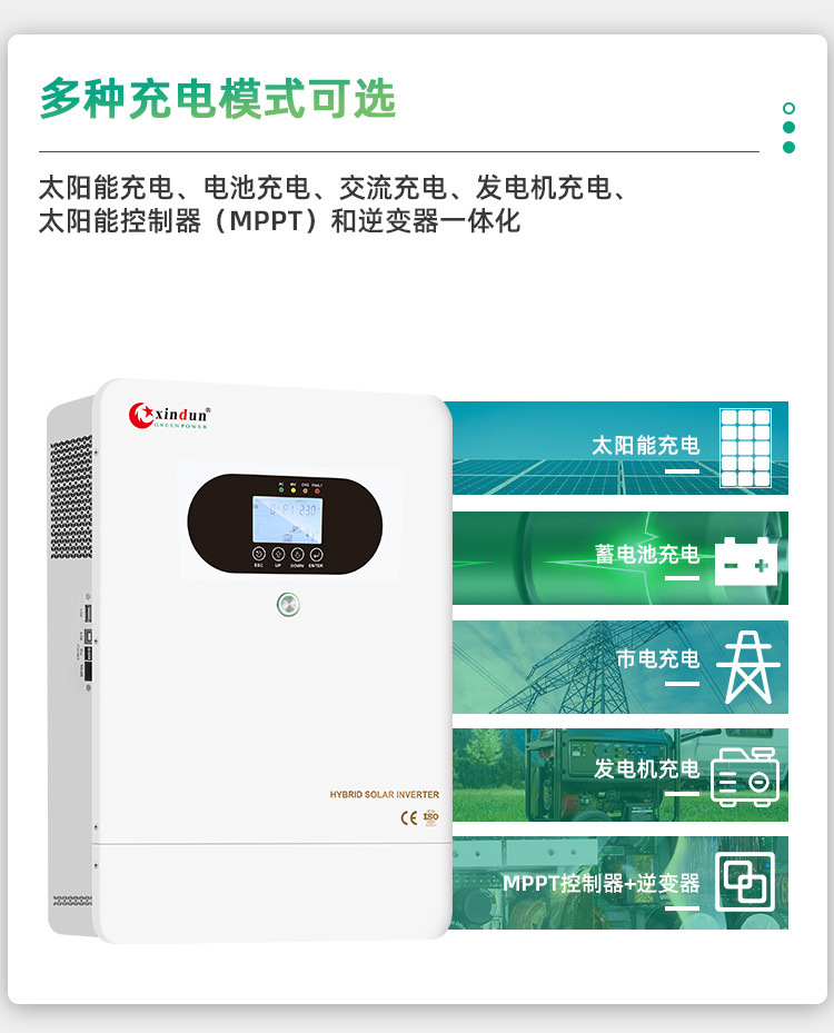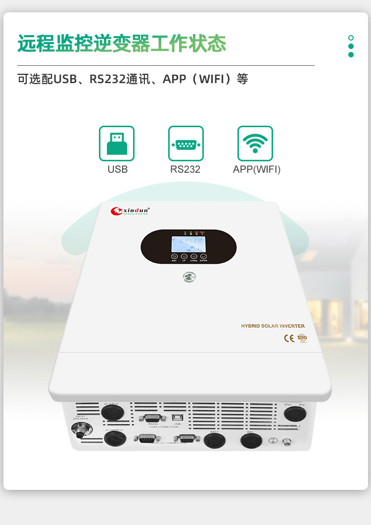 -支持太阳能和市电混合为电池充电,智能调配; -单机版本支持不带电池工作; -可设置并网馈电功能;