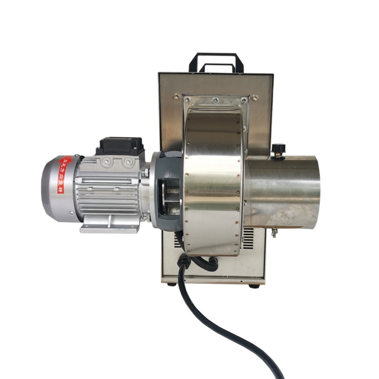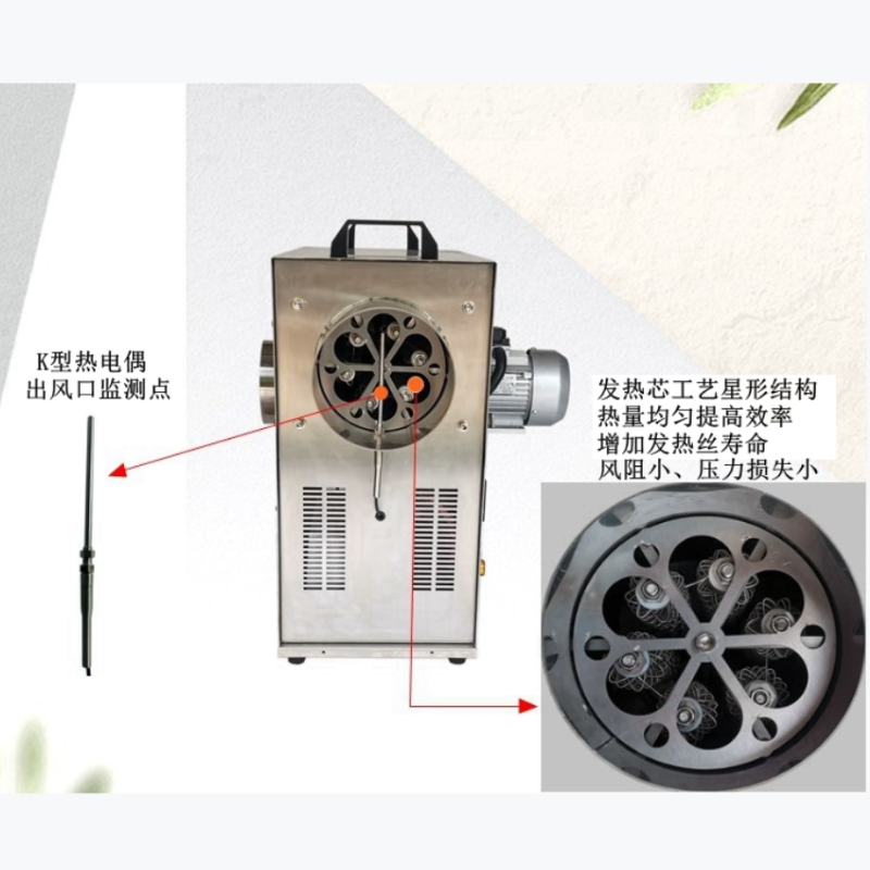 鼓风机把空气吹送到加热器里,令空气从螺旋状电热丝的内、外侧均匀通过,电热丝通电后产生的热量通过的冷空气进行热交换,从而使用出风口的风温升高,出风口处K型热电偶及时将探测到的出风温度反馈到温控仪,仪表根据设定的温度监测着工作的实际温度,并将有关信息传递回固态继电器进行而控制加热器是否工作。另外,热风机还对通风机进风口、电机设置了超温保护回路及对总电路设置了电源开关更进一步通完电后对电设备的保护。