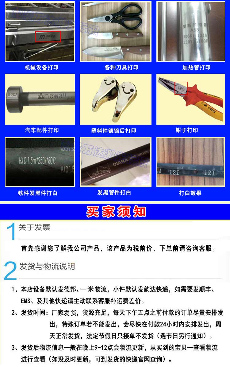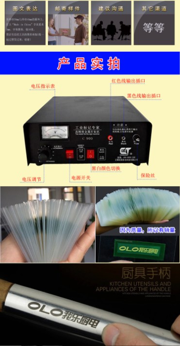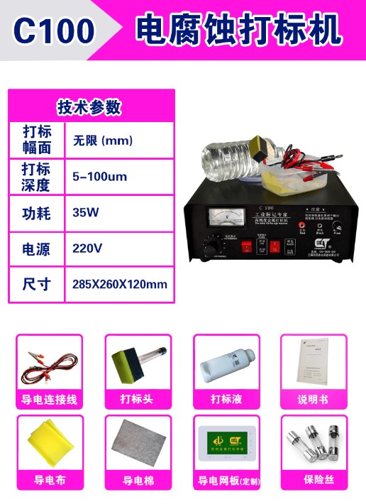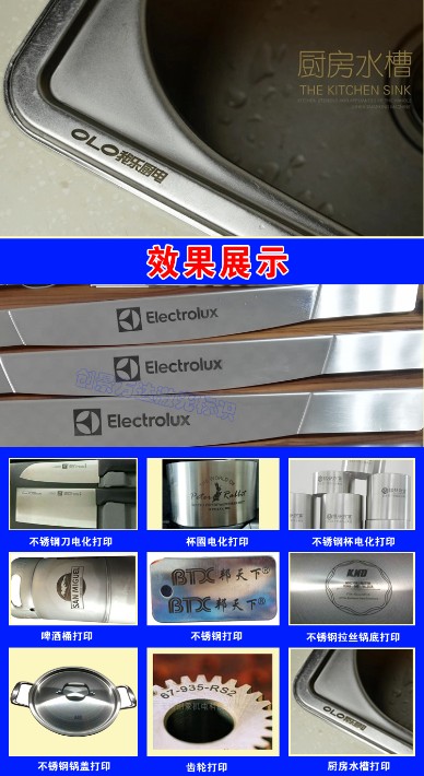 工作原理:利用低电压在打标液的帮助下使金属表面局部离子化的高科技,可在几乎任何导电的金属表面印上不脱落的任意图案或文字。