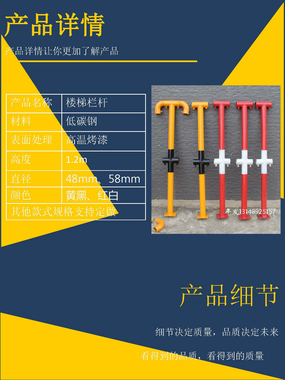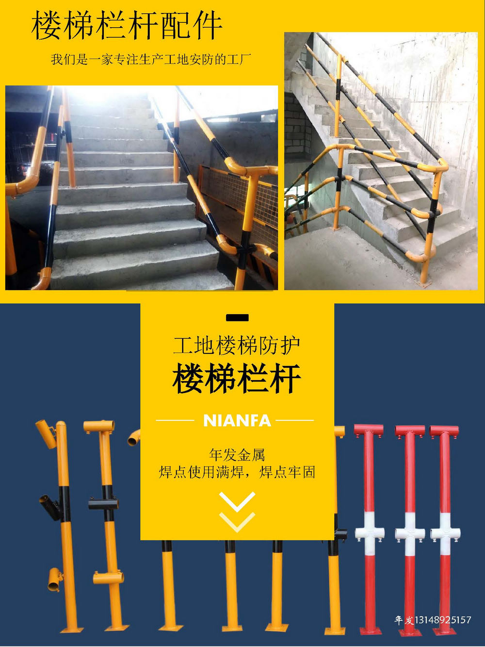 工地楼梯防护栏杆配件常用于建筑工地楼梯临边防护,防止工人在上下楼梯或作业时不慎坠落。我厂供应的楼梯栏杆配件使用钢管做原材料,焊点使用满焊焊接,焊点牢固,表面颜色使用金属防锈粉喷涂并进行高温烤制,颜色明亮,警示效果好。楼梯栏杆连接处使用螺丝连接,操作简单、安装方便快捷。