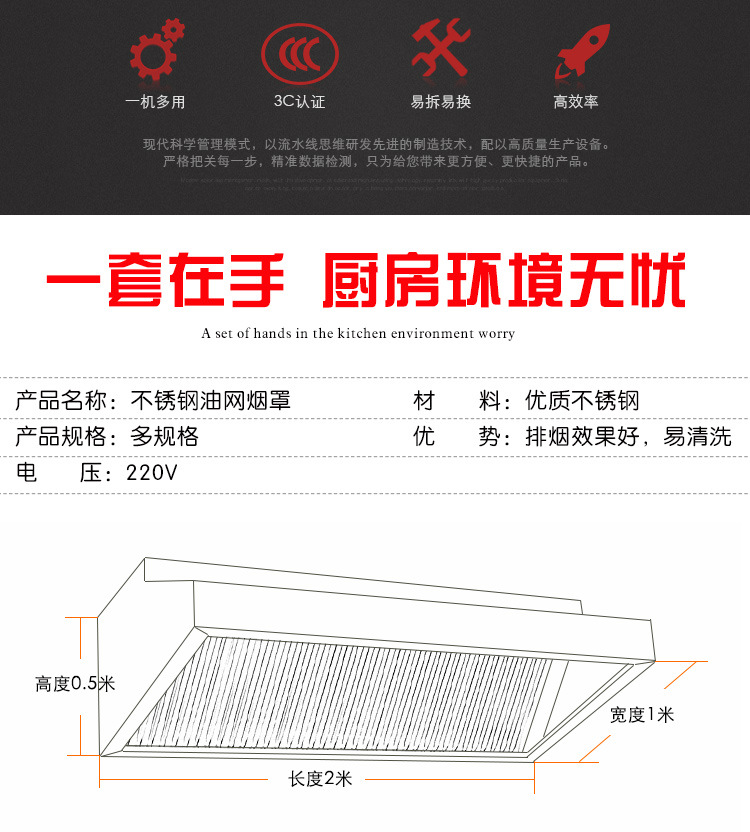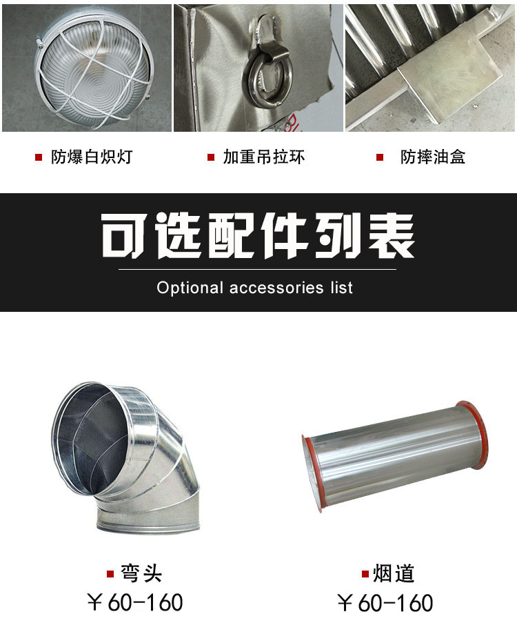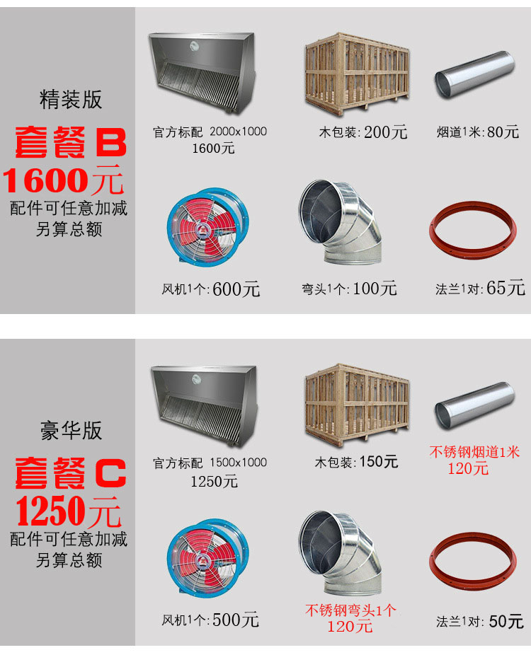 四川隆顺通风设备有限公司,可按照酒店、餐厅的厨房内灶和蒸饭柜的大小,量身定做201或者304不锈钢油烟罩,厨房不锈钢吸烟吸尘罩,我们可为您匹配好挡油板、防爆灯、油壶、风机、烟道、法兰等,您可以根据实际情况选择。本公司默认为201不锈钢烟罩,如需304不锈钢烟罩需在订货时注明。