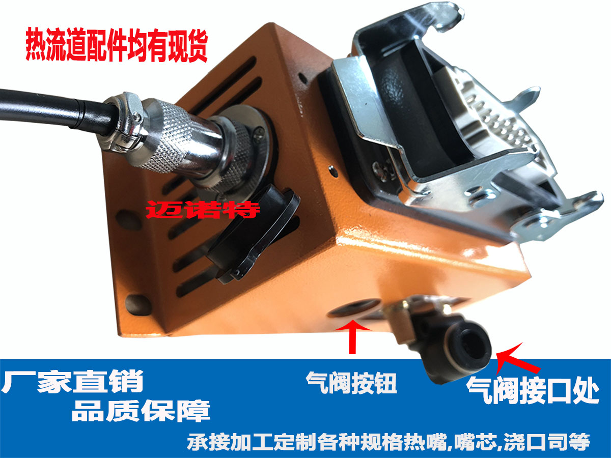 单点针阀热流道系统工作原理就是:通过气缸驱动热嘴中间的阀针上下运动,通过电磁阀与注塑机的控制信号连接,在注塑开始时,阀针往后退让热咀出胶口打开,让熔体进入型腔,在注塑结束时阀针合上,关闭进胶口,完成了一次注塑作业。由于融胶在热流道内保持融熔状态,因此整体热流道系统温度较高,而气缸系统存在多处密封件,密封件在高温环境中由于气缸活塞的频繁活动而受到严重损失,因此高温条件大大降低了单点针阀系统的使用寿命。