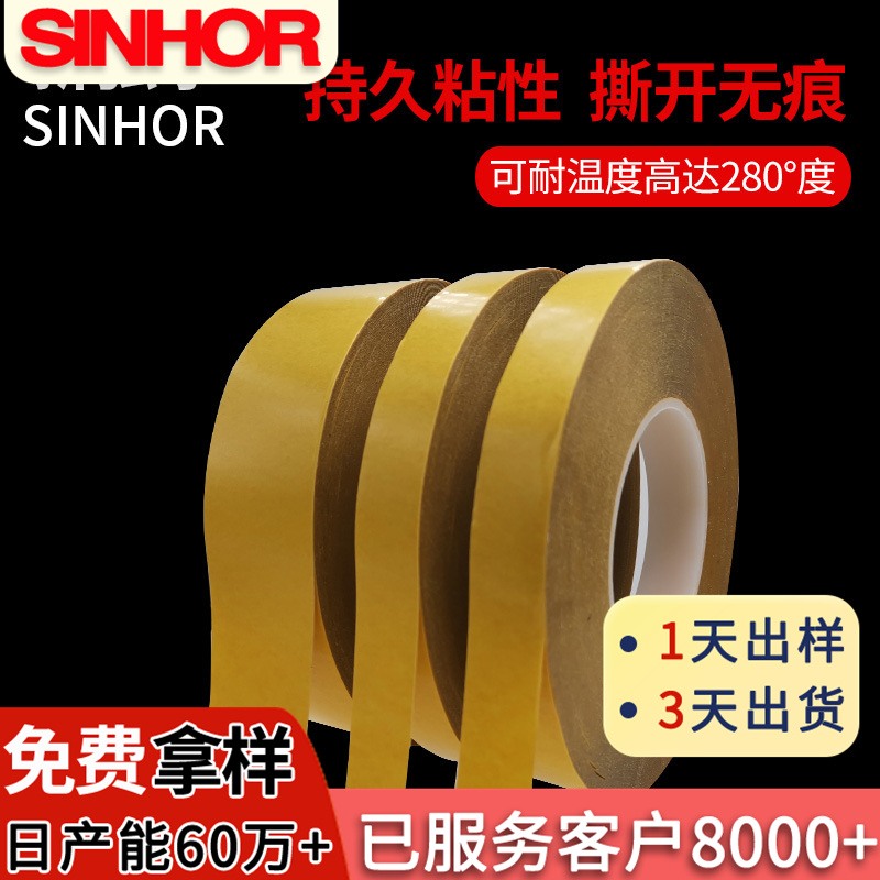 由PET双面涂布丙希酸胶制成,胶带颜色一般为透明和黑色两种,常见厚度规格为:0.03-0.25MM,具有良好尺寸稳定性、热稳定性、化学稳定性,初粘性和持粘性好,易模切加工,对塑胶、橡胶、铭牌均有良好的粘性;能适用于更宽的温度范围和恶劣环境;长期耐温100-120℃,短期耐温可达140-200℃;