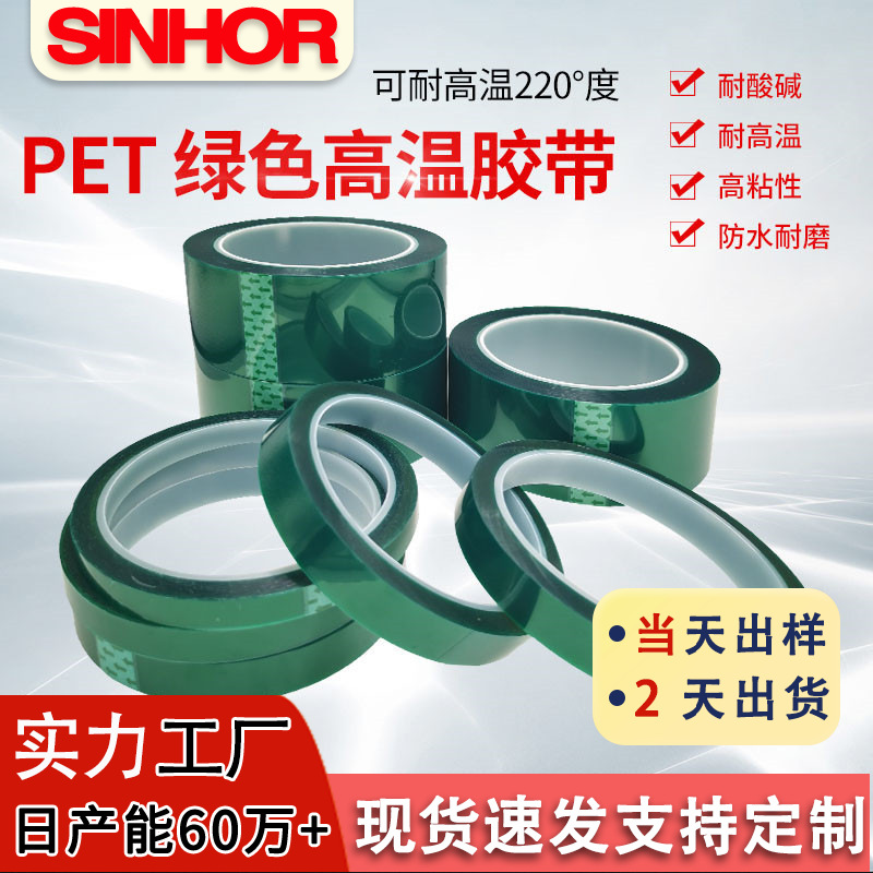 高温PET绿胶带的厚度为:0.05、0.055mm、0.060mm、0.070mm、0.080mm、0.10mm、0.12mm、0.13mm。颜色有:浅绿色、草绿色、深绿色、墨绿色、黄色、蓝色、天蓝色、黑色、透明(可定制颜色)。高温PET绿胶带主要应用于:1、机箱、钢化杯等高温喷涂喷粉遮蔽;2、PCB板高温遮蔽;3、PCB板烤锡、镀金遮蔽;4、LED点阵块、数码管、电器LED显示面板等高温灌胶遮蔽;