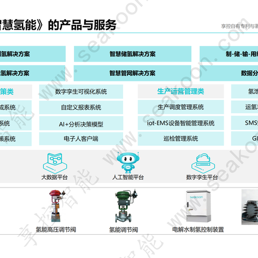 结合氢能-源-网-用-储运营管控模式和特点, 基于公司研发的智慧氢能云平台+氢能应用系统+AI生产模型+生产运营数据,为涉及氢能企业打造智慧氢能生产运营管控平台,实现智能化运营及全流程分级管控提供解决方案与系统集成服务