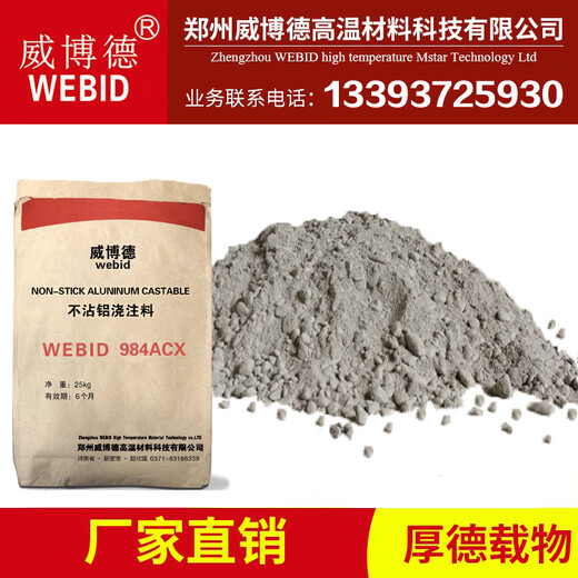 WEBID 984ACX是一种高纯矾土基低水泥浇注料,优化颗粒级配分布,添加有复合不粘铝添加剂和超微粉,具有不为铝金及合金湿润的性能、良好的不粘性和优良的抗金属对材料下渗性能,明显降低了刚玉瘤异常长大。设计用于熔铝炉炉底、下炉墙、渣线等接触铝液部位。