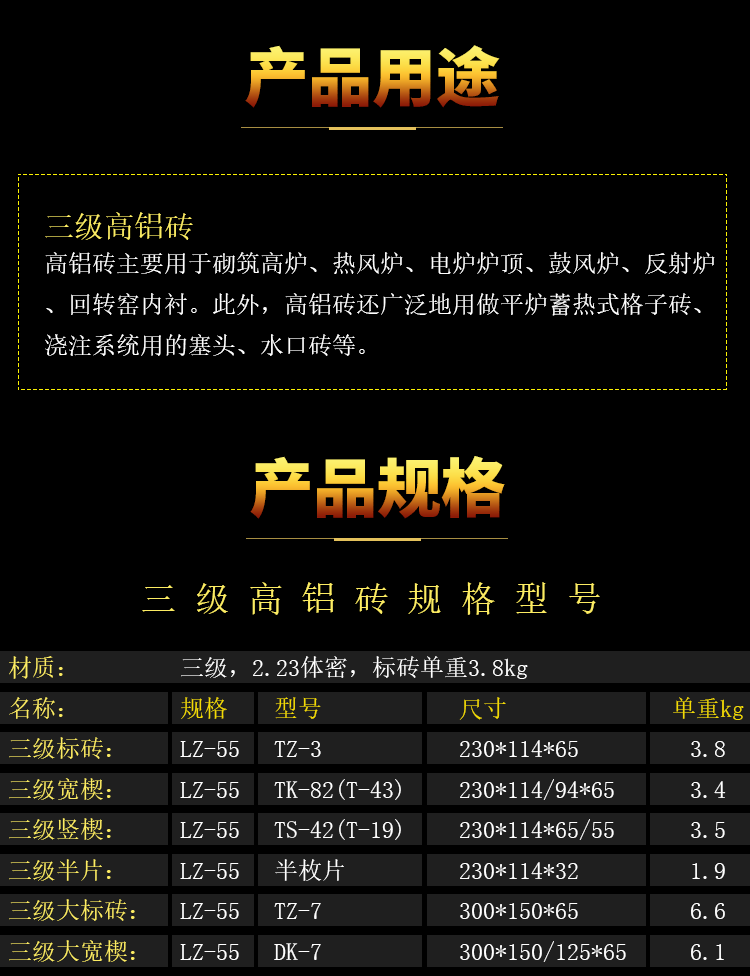 三级高铝砖用途:高铝砖主要用于砌筑高炉、热风炉、电炉炉顶、鼓风炉、反射炉、回砖窑内衬。此外,高铝砖还广泛地用做平炉蓄热式格子砖、浇注系统用的塞头、口水砖等。