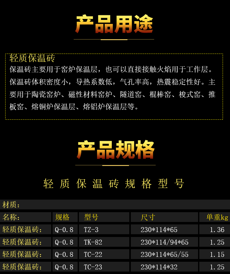 保温砖主要用于炉窑保温层,也可以直接接触火焰用于工作层,保温砖体积密度小,导热系数低,气孔率高,热震稳定性好。主要用于陶瓷炉窑、磁性材料炉窑、隧道窑、棍棒窑、梭式窑、推板窑、熔铜炉保温层、熔铝炉保温层等。