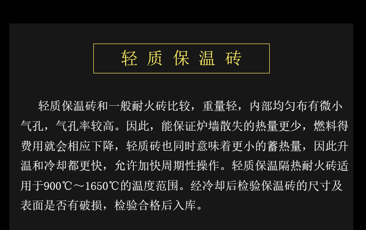 轻质保温砖和一般耐火砖比较,重量轻,内部均匀布有微小气孔,气孔率高。因此,能炉墙散失的热量更少,燃料的费用就会相应下降,轻质砖也同时意味着更小的蓄热量,因此升温和冷却都更快,允许加快周期性操作。轻质保温隔热耐火砖适用于900℃-1650℃的温度范围。经冷却后检验保温砖的尺寸及表面是否有破损,检验合格后入库。