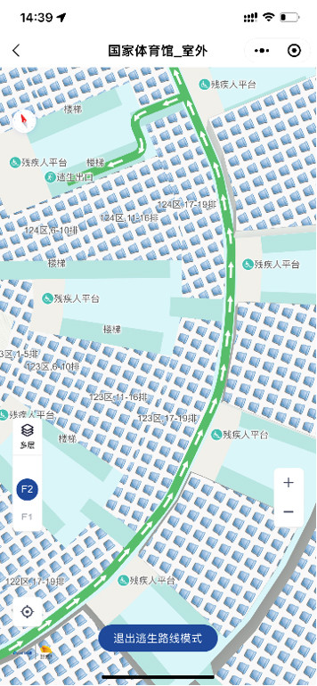 观众入场时只需打开国家体育馆公众号就可以访问导航系统,输入座位号就可以获得通往座位的快路径及其他备选路线。地图通过3D仿真建筑模型且支持360°自由旋转缩放,观众可以在系统上查找到场馆内的楼梯、紧急疏散口、残疾人平台等点位信息。此外,系统还支持查看场馆内的疏散路线图,可以作为应急疏散决策的辅助工具为安全救援与应急智慧提供可靠支持。