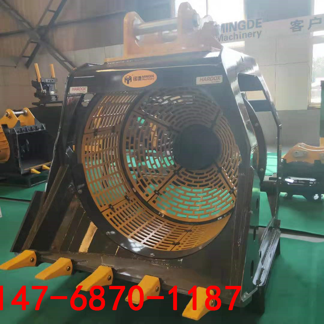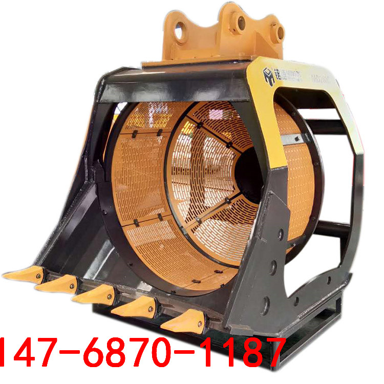 挖机滚筒筛分斗广泛用于各种难洗的大块矿石,该洗矿机分圆筒型和圆筒加筛条型两种。后一种可把被洗物料分成 40mm和-40mm两级产品,-40mm可再经双螺旋槽式洗矿机进一步擦洗可将物料分为 2mm和-2mm两级产品,洗矿效率可达98%左右,这种组合对目前难洗矿石是有效的方法。滚筒式石料洗矿机主要针对修建高滚筒式石料洗矿机路、桥梁、隧道等高标准工程,用来清洗砂石料的设备,比国内同类产品,具有便于移动、处理能力强、洗净率高、节省动力等特点。适用于细粒度和粗粒度物料的洗选作业。该洗矿机结构合理、维修便利、处理量大、功率消耗小、洗净度高。滚筒洗石机采用新颖的密封结构、滚筒式石料洗矿机装置、可调式污水槽,确保了该系列产品、耐用,清洗、脱水效果好,细粒产品保持稳定等特点。