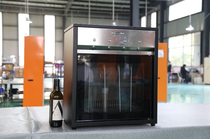 红酒机内置4个酒瓶位,采用氮气发生器制氮绝氧进行保鲜存储。存储温度5-15摄氏度可调,采用压缩机制冷或者半导体电子制冷,满足不同酒品和客户口感需求。取酒时扫二维码,选择需要的酒品和酒量,单次出酒量少可达30毫升。内置Android操作系统,通过APP客户端实现线上线下无缝对接。可实现一机多用一机多类,为消费者提供真正的放心健康酒。