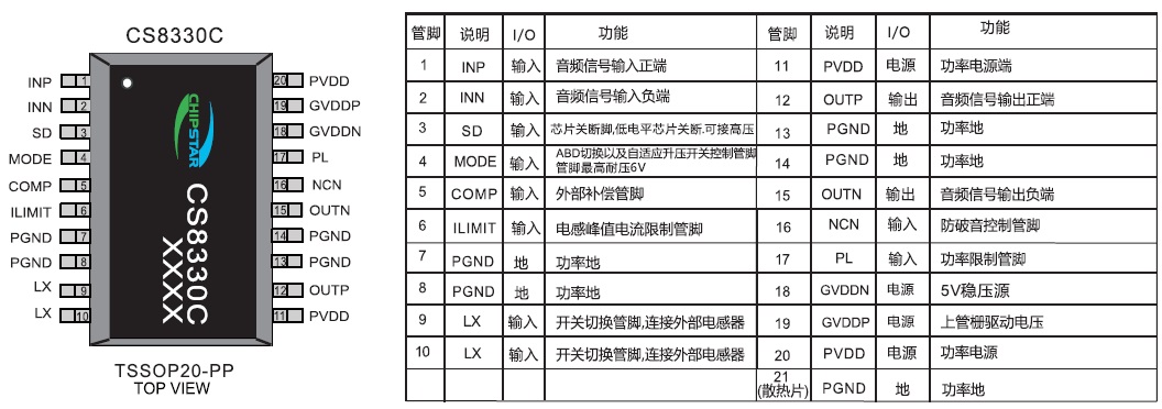 CS8330C提供了纤小的的TSSOP20-PP封装形式供客户选择,其额定的工作温度范围为-40℃至85℃。 描述 内置BOOST模块R类结构,集成AB类D类两种模式 输出功率 PO at 10% THD+N, VIN = 3.7V RL = 4 Ω 15W(D MODE NCN OFF) PO at 1% THD+N, VIN = 3.7V RL = 4 Ω 12W(D MODE NCN OFF) PO at 10% THD+N, VIN = 7.4V RL = 4 Ω+22uH 15W(D MODE NCN OFF) PO at 10% THD+N, VIN = 7.4V RL = 3 Ω+22uH 18W(D MODE NCN OFF) 的"噼噗-咔嗒"(pop-noise)杂音抑制能力 工作电压范围:2.7V到12V 支持单节锂电池和12V适配器双电源供电的应用 自适应升压功能 内置4种防破音模式 内置POWER-LIMIT(功率限制功能) 无需滤波的Class-D结构 高84%的效率(Vbat=8.4V) 高电源抑制比(PSRR):在217Hz下为70dB 启动时间 (200ms) 静态电流 (10mA) 低关断电流 (50µA) 过流保护,短路保护和过热保护 封装 TSSOP20-PP 应用 便携式蓝牙音箱 引脚排列及定义