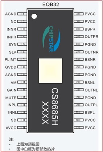 CS8685H提供了特殊的EQB32封装形式供客户选择,合适的封装尺寸为客户安装散热器件提供了大的方便,其额定的工作温度范围为-40℃至85℃。