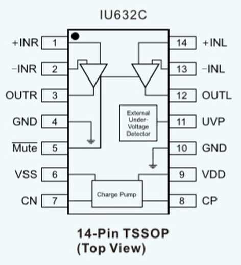 IU632C管脚功能兼容DRV632/SGM8903/AD22650,采用14引脚TSSOP14L封装。