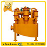 水力旋流器是由上部的一个中空圆柱体,下部一个与圆柱体相通的倒椎体,二者组成水力旋流器的工作筒体。除此,水力旋流器辅助设备有给矿管、溢流管、溢流导管和沉砂口。水力旋流器在选矿工艺流程中主要用于分级、分选、浓缩与脱泥;当水力旋流器用作分级设备时,主要用来与磨机组成磨矿分级系统;当用作脱泥设备时,可用于重选厂脱泥;当用作浓缩脱水设备时,可用来将选矿尾矿浓缩后送去充填地下采矿坑道。