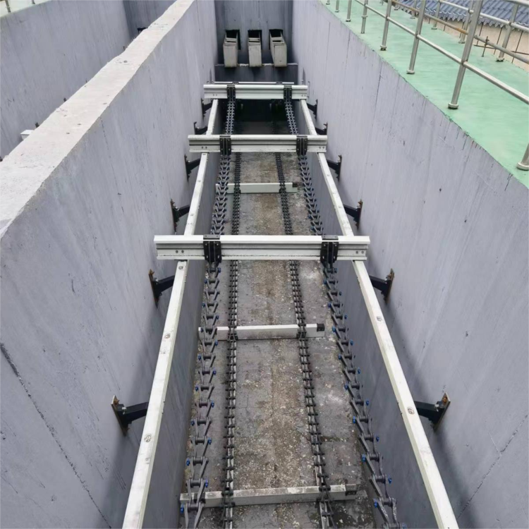 2)刮板在他中作连续的直线运动,不必往返换向,因而不需要行程开关。驱动装置设在池顶的平台上,配电及维修都很简便。