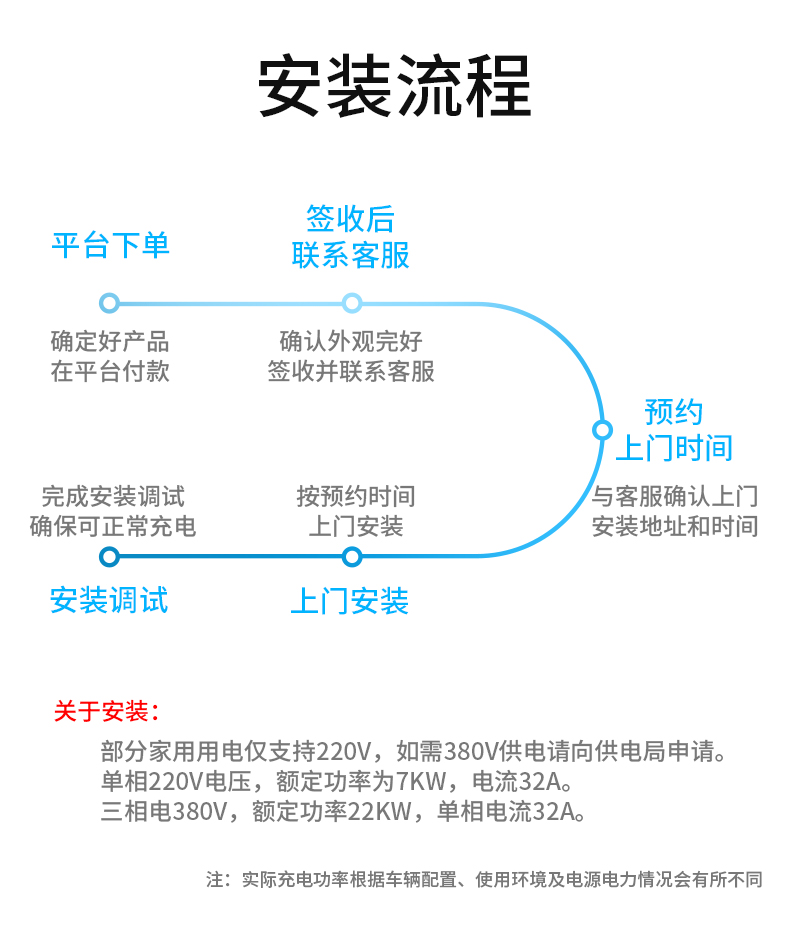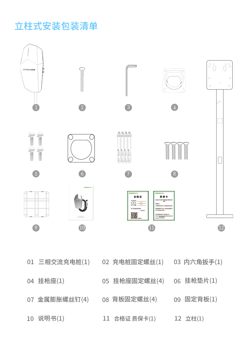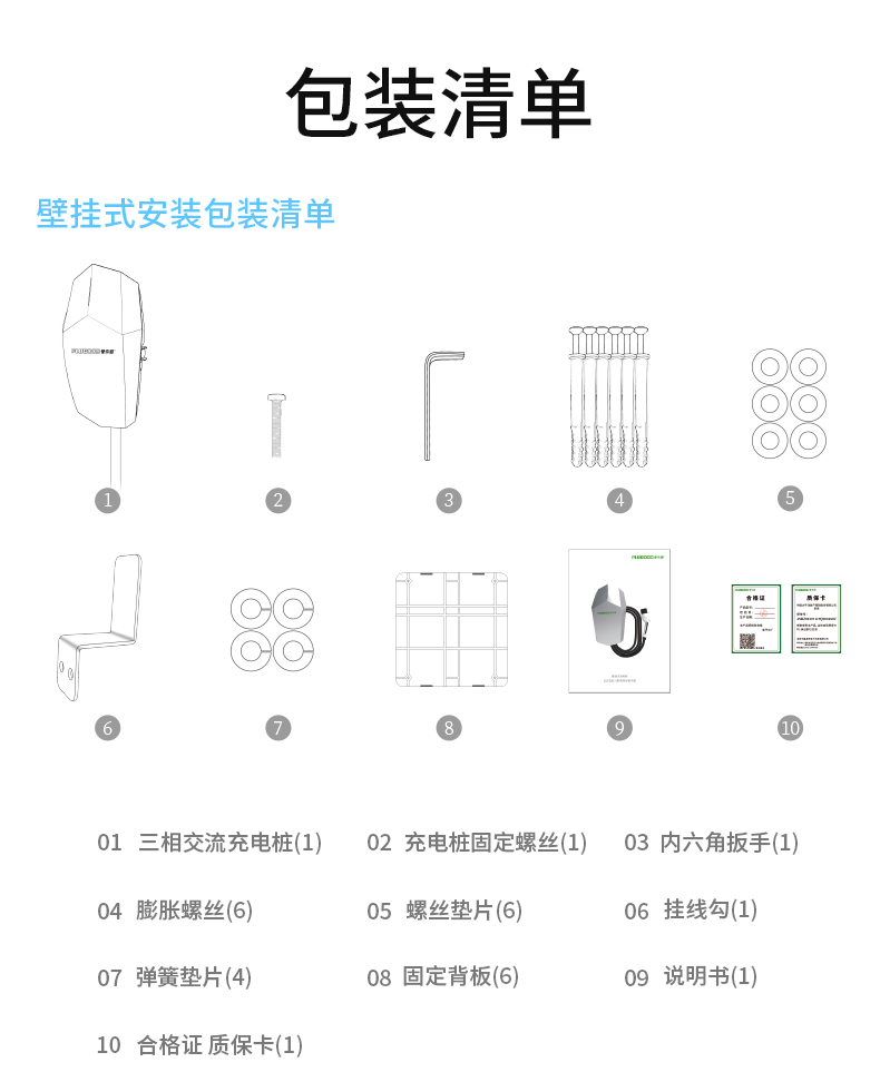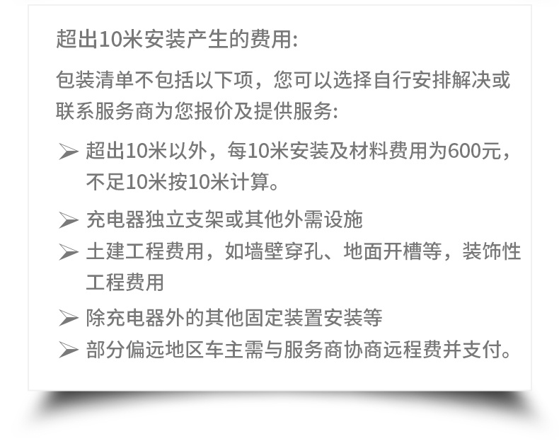 壁挂式家用充电器一台、5*10平方纯铜线缆和安装材料、40PVC穿线管、配电箱及安装费用、正泰3P80A空开、一次现场勘测、壁挂式基础安装费、电缆穿40PVC管安装、充电器安装及送电调试、一年质保