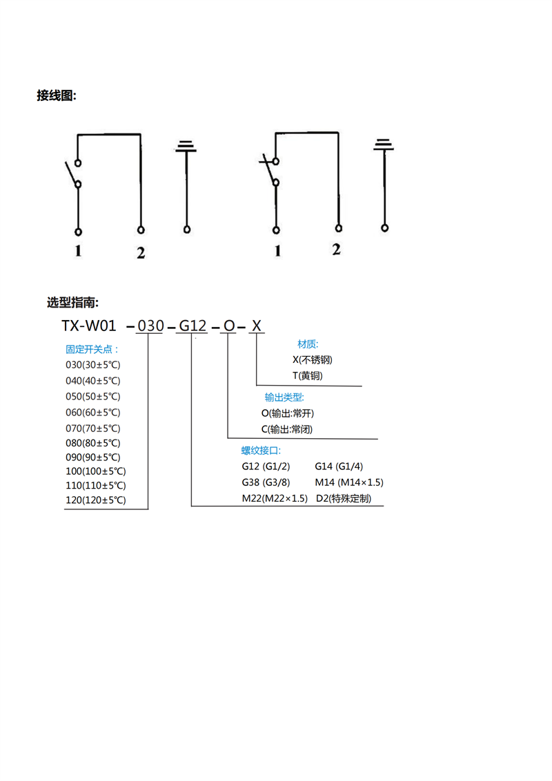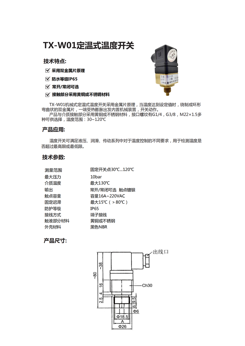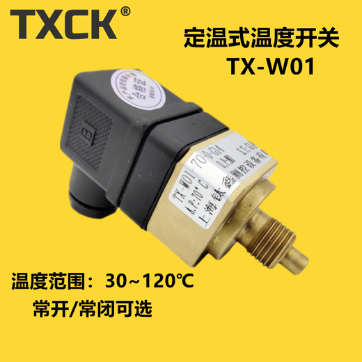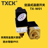TX-W01机械式定温式温度开关采用金属片原理,当温度达到设定值时,绕制成环形弯曲状的双金属片,一端受热膨胀出发内置机械装置,开关动作。