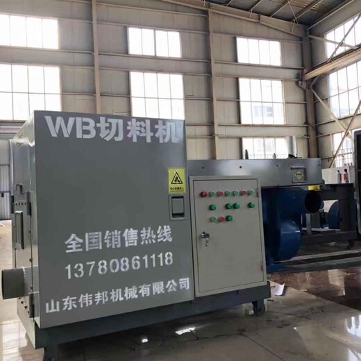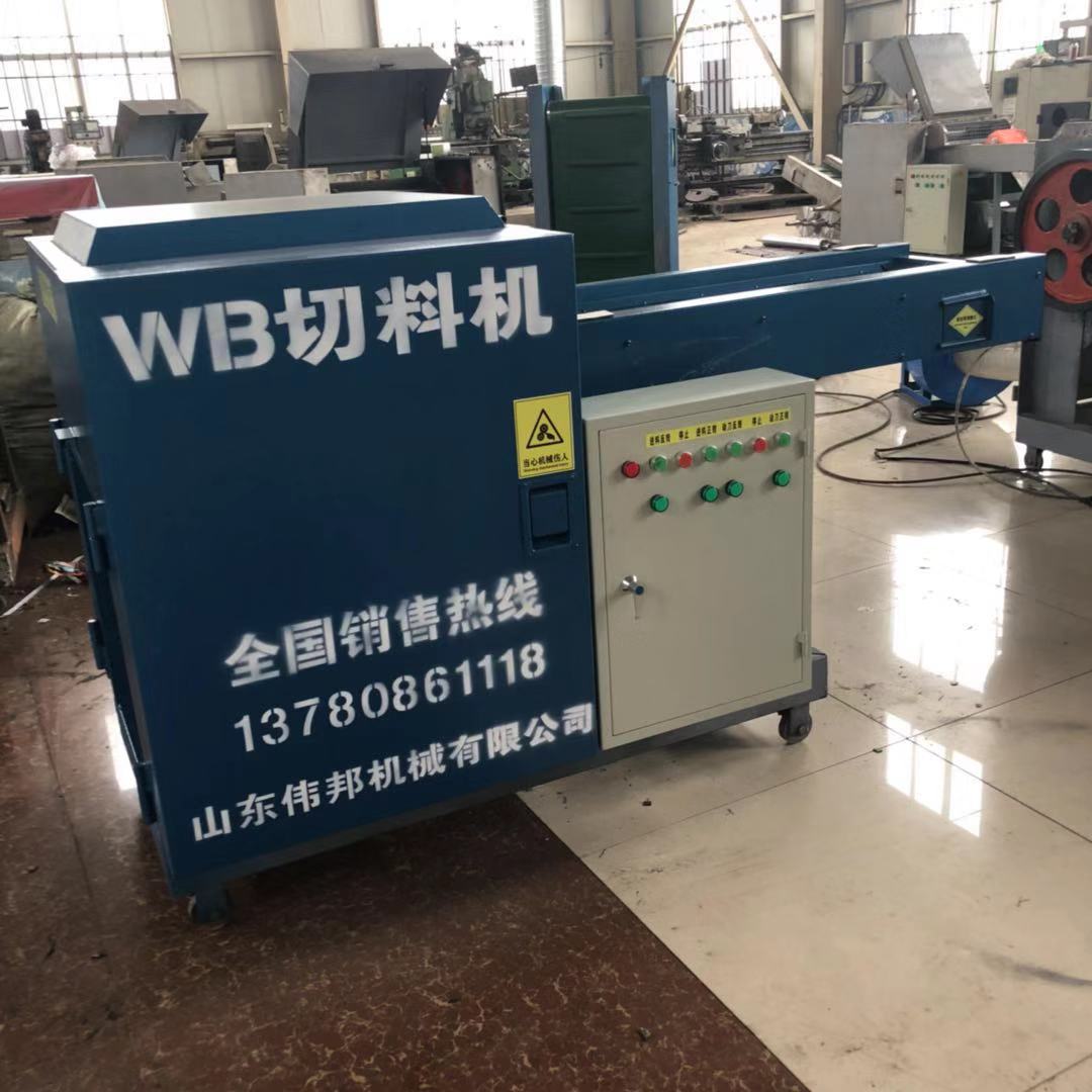 山东伟邦机械有限公司生产剁布机,剁线机,纤维切断机,碎布机,粉碎机。打开气泵开关,接通气源,拉起操作台左侧手动气压开关,将压布辊升起。 2. 将复合好的成品毯料放在压布辊下面,按下操作台左侧手动气压开关,压布辊下降,压住毯料。注意操作时手要放在布料外侧,以免压伤手指。 3. 将操作台上 机动/手动 开关至于手动位置,接通电源,调节操作台左侧变频器旋钮,将其数值调节为18---20HZ左右,调节操作台右侧变频器旋钮,将其数值调节为2.45---2.55HZ左右。将传送带机架上的光控调节至相应的电热毯尺寸规格。 4. 打开操作台下边柜门,里面有三相、单相开关各一个,合上开关,切布机开始运转。 5. 要毯料的花点与压布辊,切刀槽平行,注意观察毯料的运行轨迹,在花点运行到切布槽左侧切刀刃处,迅速将手动开关扳至机动位置,切布机开始自动运行。 6. 操作人员要随时注意观察切下的毯料尺寸,毯料的分切位置。