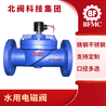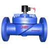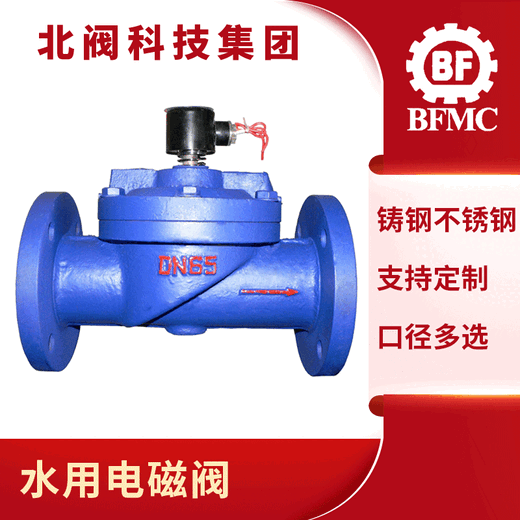 水用电磁阀通径15~100为膜片式为二次开阀的先导式电磁阀,通径125~300为三次开阀的先导式电磁阀,其结构主要由副阀和主阀组成。根据断电时所处开关状态的不同,可分为常闭电磁阀和常开电磁阀。常闭电磁阀,常位时,活动铁芯封住副阀口,阀腔内压力平衡,副阀、主阀口封闭。当线圈通电,产生电磁力将活动铁芯吸上,副阀打开,主阀腔内的介质自导阀门外泄,以致主阀阀杯上下产生压力差,膜片或阀杯被托起,主阀口开启,阀呈通路状态。当线圈断电,磁场消失,活动铁芯复位,封闭副闭口,断而副阀和主阀阀杯内压力上升,主阀阀杯压向阀座,阀又呈关闭状态。常开电磁阀,当线圈通电时,产生磁力,衔铁在磁力作用下下移,推动副阀阀杯下移,副阀关闭,随着主阀阀杯上下压差趋向相等,主阀阀杯由自重压向密封面,阀门关闭。当线圈断电后,磁力为零,衔铁和副阀阀杯由于弹簧作用上升,副阀打开,主阀阀杯内介质经副阀流走,压力下降,当压力降到一定值后,主阀阀杯由上下压差作用向上升起,主阀打开,阀门开启。
