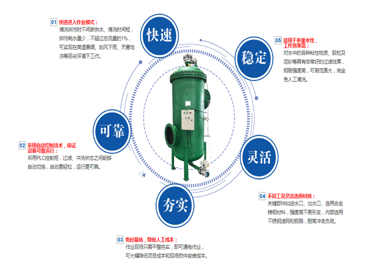 当过滤器工作时,水流导向阀处于开启状态,水流由入口进入过滤器,经过滤网过滤后流入出口。本机采用压差控制、定位控制自动清洗滤网。当过滤器进出口差压达设定值或定时器达到预置时间时,电动控制箱发出信号,排污阀打开(水流导向阀处于开启状态),水流冲洗粘在滤网内壁上的杂质被进一步冲洗排出,当水流导向阀处于全关状态下,水流被迫从过滤器进口段网孔进入滤网外侧,大部分净液从出口流出,一部分净液又从滤网外侧进入滤网内部(因为系统会处于泄压状态,滤网内部压力小于外侧压力),从而对滤网进行反冲洗,特殊结构的不锈钢契形滤网使得在滤网内部产生了喷射效果,任何杂质都被从光滑的内壁上冲走。当过滤器进出口压差恢复正常或定时器设定时间结束后,电动排污阀关闭,水流导向阀开启。整个冲洗过程系统可正常工作,无需停机。