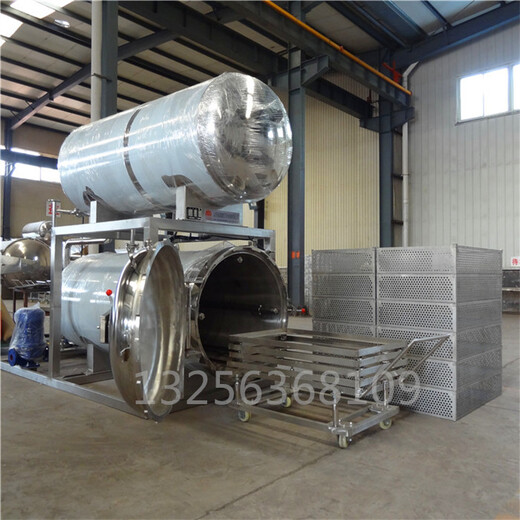 由锅体、锅盖、开启装置、锁紧楔块、安全联锁装置、轨道、灭菌筐、蒸汽喷管及若干管口等组成。锅盖密封采用充气式硅橡胶耐温密封圈,密封可靠,使用寿命长。具有受热面积大,热、加热均匀、液料沸腾时间短、加热温度容易控制等特点。杀菌锅主要用于食品行业、医药等各个领域。