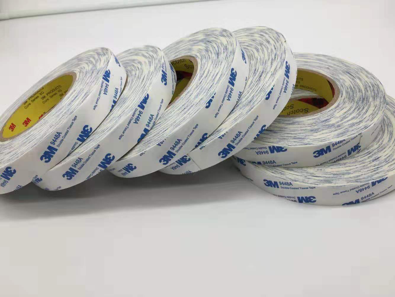 M9448棉纸双面胶是3M双面胶中一款无纺布基材双面胶,由无纺布双面涂布丙希酸胶制成,具有良好的初粘性和持粘性,易模切加工,稳定性好,对塑胶、橡胶、粗糙表面均有良好的粘性;在高温下具有良好持粘力,按胶带颜色不同分为白胶和黑胶。该胶广泛用于加工行业。