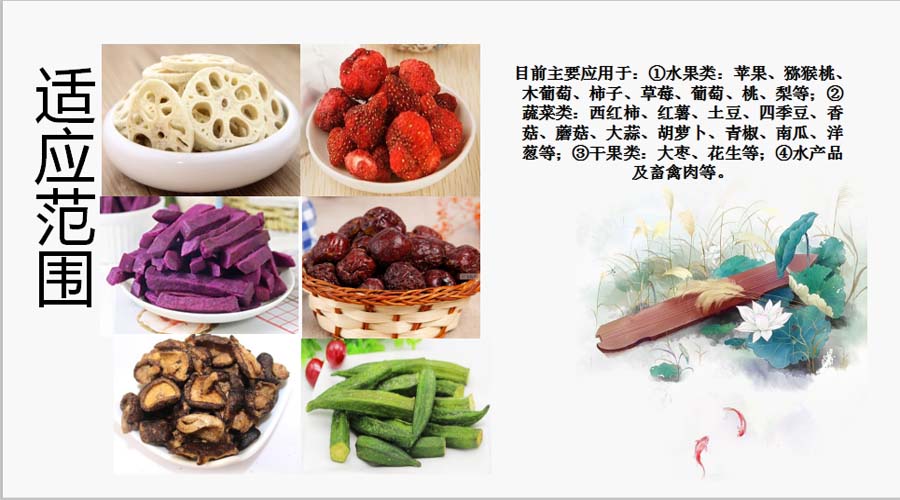 真空油炸脱油有果。目前主要应用于:①水果类:苹果、猕猴桃、木葡萄、柿子、草莓、葡萄、桃、梨等;②蔬菜类:西红柿、红薯、土豆、四季豆、香菇、蘑菇、大蒜、胡萝卜、青椒、南瓜、洋葱等;③干果类:大枣、花生等;④水产品及畜禽肉等。