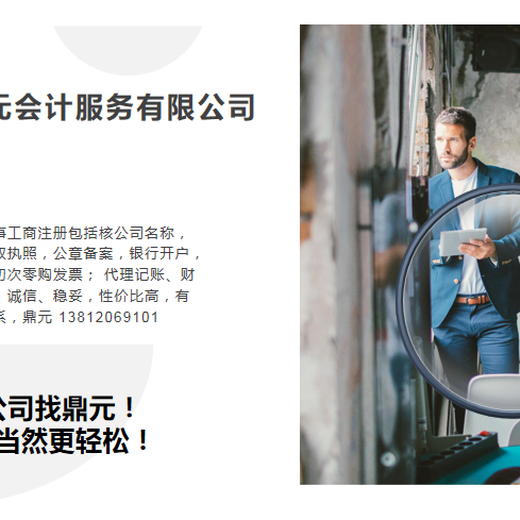 本公司从事工商注册、代理记账、财务咨询等业务。工商注册包括核公司名称,起草章程,领取执照,公章备案,银行开户,税务局报到,初次领购发票等以及工商变更业务,包括变更企业法人、变更企业股东、变更经营地址、变更经营范围、变更企业名称等; 代理记账包括建立各科目总账、明细账,每月25日前收集客户单位当月发票并代为至国税认证抵扣进项税额,每月各项税种申报,编制记账凭证,登记各科总账、明细账,出具财务报表;以及各种税务疑难复杂问题;财务咨询包括以前账目整理咨询,经营相关发票、会计处理等咨询。诚信、稳妥,,有意者可电话联系。