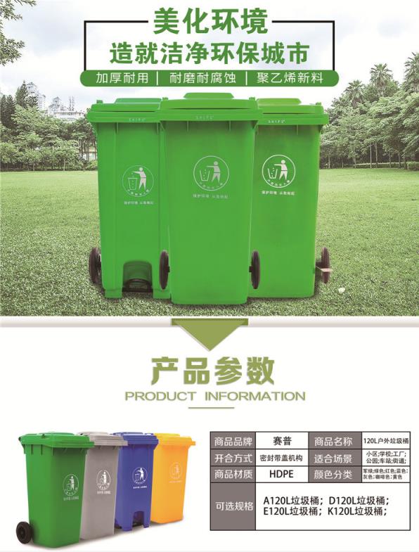 本产品耐酸碱、耐腐蚀;每只垃圾桶均装有轮胎,您无需再行置办小垃圾车,更可节约费用,产品可彼此套叠,运送方便,节约空间与费用。广泛应用于各种环境,更可用于垃圾分类搜集,如物业、环卫、工厂、餐饮等行业,色彩有多种多样可供选择。
