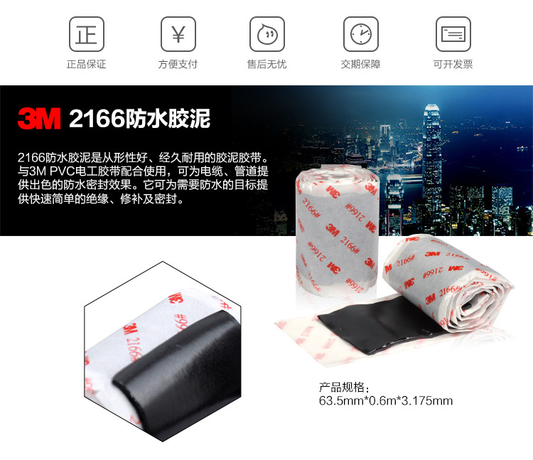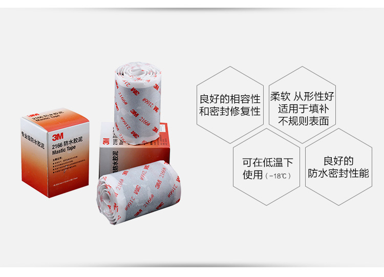 3M2166防水密封胶带是从形性好、的胶带。与3M PVC电工胶带配合使用,可为电缆、管道提供特殊的防水密封效果。它可为需要防水的目标提供快速简单的绝缘、修补及密封作用。