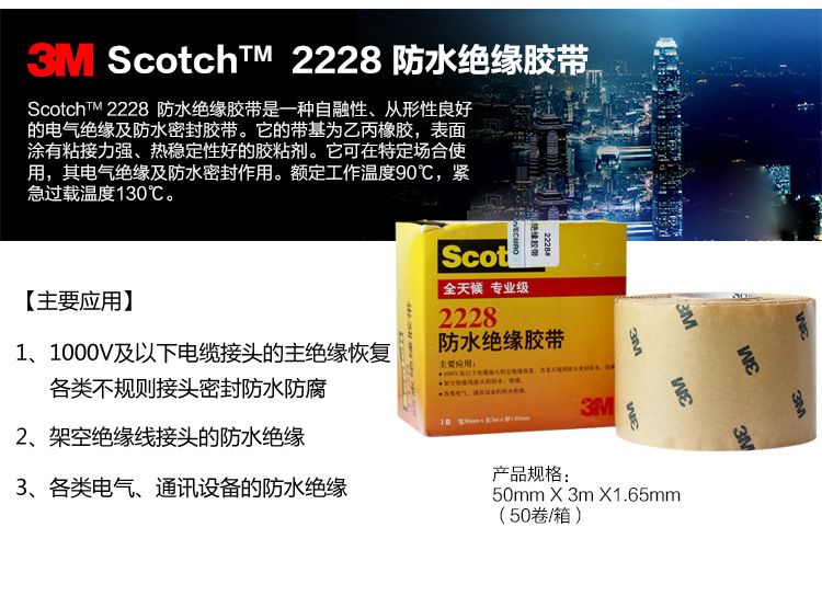 3M2228防水胶带是一种自融性,从行性良好的电气绝缘及防水密封胶带。它的带基为乙丙橡胶,表面涂有粘接力强,热稳定性好的胶粘剂。它可用在电气绝缘和防水密封等场合。额定工作温度90℃,紧急过载温度130℃。2228胶带和33+PVC胶带一起使用。可对电气线路提供可靠的防水密封和优良的抗紫外线保护。