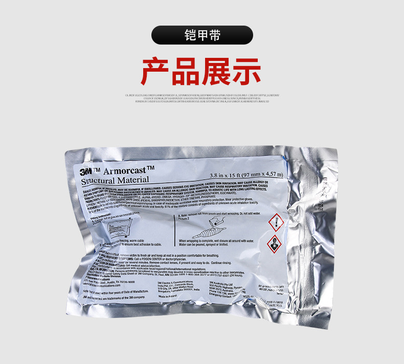 3M Armorcast工业装甲缠绕带,在国内又称装甲带、铠装带、铠甲带、玻璃纤维工业绷带。3M Armorcast工业装甲缠绕带是美国3M公司自主研发的技术,将特种玻璃纤维编织成度、高弹性结构的织物,然后在编织带表面涂覆水固化高分子化合物而制成的一种玻纤制品。它具有遇水快速固化、操作简便和应用范围广等特点,固化后形成的结构物弯曲强度和拉伸强度高、耐水耐腐蚀。由于其使用方便,便于携带,并可任意塑形,近年来已越来越多地应用到电力、化工、海洋、矿业、通信等多个领域。主要用于10kV、35kV冷缩电缆中间接头保护,是快速防漏修补,尤其是管道修补、特殊环境场合支架结构维修、防护、防腐蚀、电缆密封拼接和高温下使用的理想材料。
