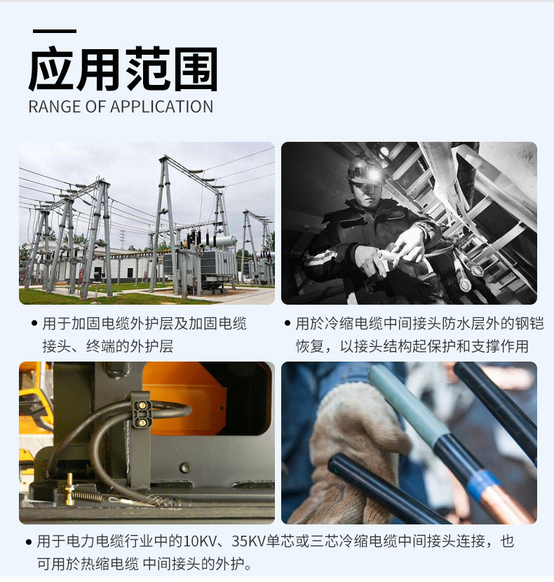 3、用于电力电缆行业中的10kV、35kV单芯或三芯冷缩电缆中间接头连接,也可用于热缩电缆 中间接头的外护。