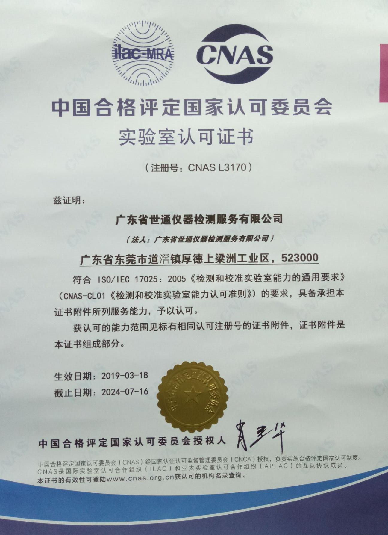 世通计量校准实验室经国家实验室认可(CNAS)认可, 认可号L3170,国际实验室互认组织(ILAC-MRA)授权, 通过 ISO1702 5国际计量准则要求,所出具的校准证书和检测报告获得与CNAS 签署互认多边协议国家地区实验室认可机构其它成员的承认和认可。