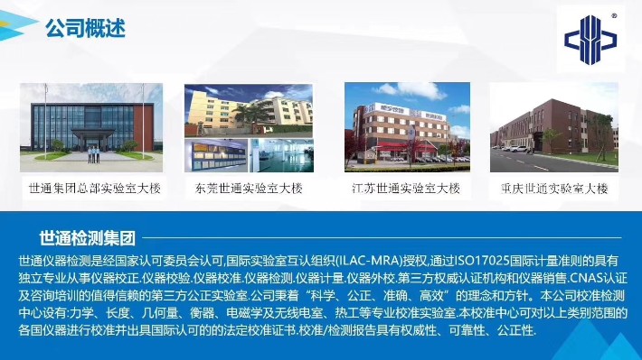 世通仪器检测服务有限公司是为企业提供仪器计量、仪器校准、仪器校正的第三方公正实验室,所出校准证书/报告均符合ISO/IEC17025:2005仪器校准和检测实验室能力的要求。本公司同时拥有广东东莞仪器校准实验室和江苏昆山仪器校准实验室,其中东莞世通仪器校准实验室注册资本1000万元,江苏世通仪器校准实验室注册资本1000万元,实际投资资本超过3000万元,并都建有标准规范化科室,实验室占地面积近万平米,仪器校准设备1000余套。