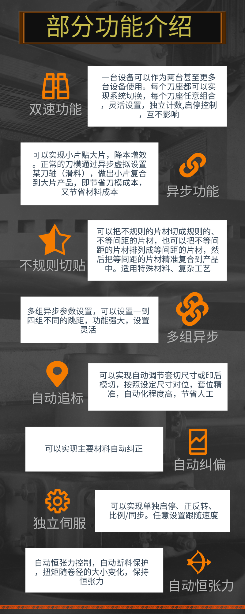 为适应不同规格的模切产品,可根据模切厂商的要求量身订做模切设备。 (1)双速功能:一台设备可以作为两台设备使用。每个刀座都可以实现系统切换,每个刀座任意组合,灵活设置,立计数,启停控制,互不影响。 (2)异步功能:可以实现小片贴大片,降本增效。正常的刀模通过异步虚拟设置某刀轴(滑料),做出小片复合到大片产品,即节省刀模成本,又节省材料成本。 (3)切(贴)不规则片材(石墨片)的功能:可以把不规则的片材切成规则的、不等间距的片材,也可以把不等间距的片材排列成等间距的片材,然后把等间距的片材复合到产品中。适用特殊材料、复杂工艺。 (4)多组异步参数设置,可以设置一到四组不同的跳距,功能强大,设置灵活。 (5)自动追标、调整功能:可以实现自动调节套切尺寸或印后模切,按照设定尺寸对位,套位,自动化程度高,节省人工。 (6)立伺服控制:可以实现单启停、正反转、比例/同步。任意设置跟随速度。 (7)自动恒张力控制,自动断料保护,扭矩随卷径的大小变化,保持恒张力。 (8)自动纠偏功能:可以实现主要材料自动纠正。 (9)具有安全保护功能,限度保护人身安全。安全系数高,操作简单方便。 (10)除静电功能:消除材料静电与脏污,提高模切质量。