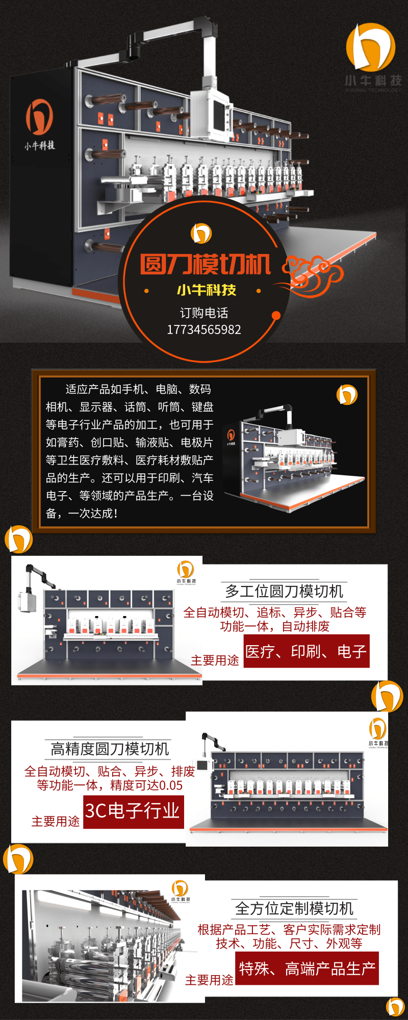 本公司生产多工位圆刀机,集覆膜、贴合、打孔、模切等于一体,是全自动多功能的一体机。可以被广泛应用于3C行业、印刷行业、医疗耗材生产等行业,也可以根据您的需求定制,为了更好的为您服务,为了给您提供更适合您的产品,请您一定要如实准确的告知我们您的需求,也欢迎您到公司或者使用本公司设备的厂区参观考察并试用机器,记得带着您的样品哦!具体工艺及报价,请与客服联系报价! 欢迎来电垂询:17734565982 同号。
