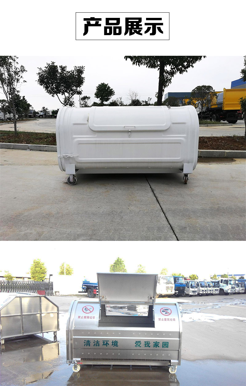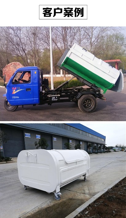 车厢可卸式垃圾箱配套勾臂式垃圾车装有液压举升机构,能将勾臂车的车厢倾斜到接近的角度,用于实现垃圾依靠自重能自行卸下垃圾的一种钩臂垃圾箱;其主要特点是垃圾收集方式简便、环保性好,提高小型垃圾车的使用效率,广泛适用于环卫、市政、物业小区等场所的生活垃圾的收集与储存。
