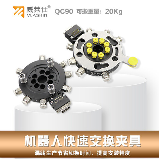 VLASHI威莱仕机器人快换夹具,混合生产线夹具可节省时间,提高生产效率应用于自动化塑胶行业、汽车配件行业、电子工厂、机器人自动化、机械手夹具。产品信息:QC90-20KG材质:本体超硬铝制,装卸部铁质可搬重量:20kg重量:226(公端)+150g(母端)安装后的厚度:34.5mm。