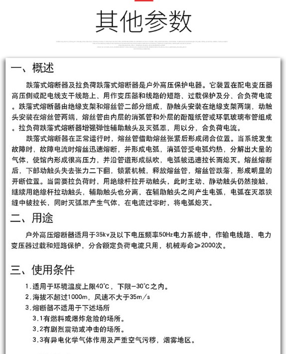 跌落式熔断器适用于频率为50HZ、额定电压为35KV及以下的电力系统中,装在配电变压器高压侧或配电之干线路上。主要功能有对保护性能要求不高的地方,它可以与隔离开关配合使用,代替自动空气开关;还可以与负荷开关配合使用,代替价格高昂的断路器。同时还具有短路保护、过载及隔离电路。