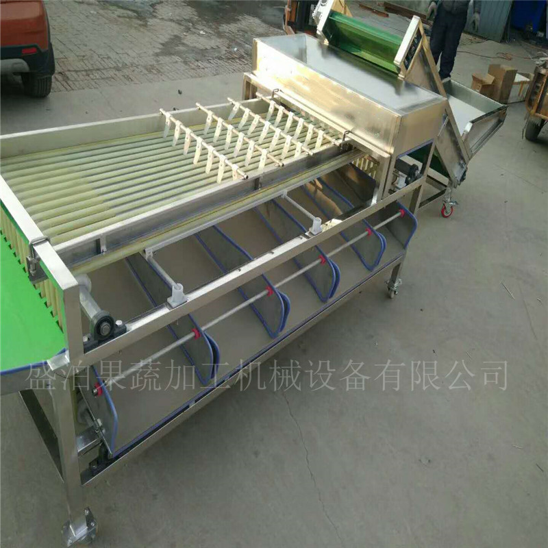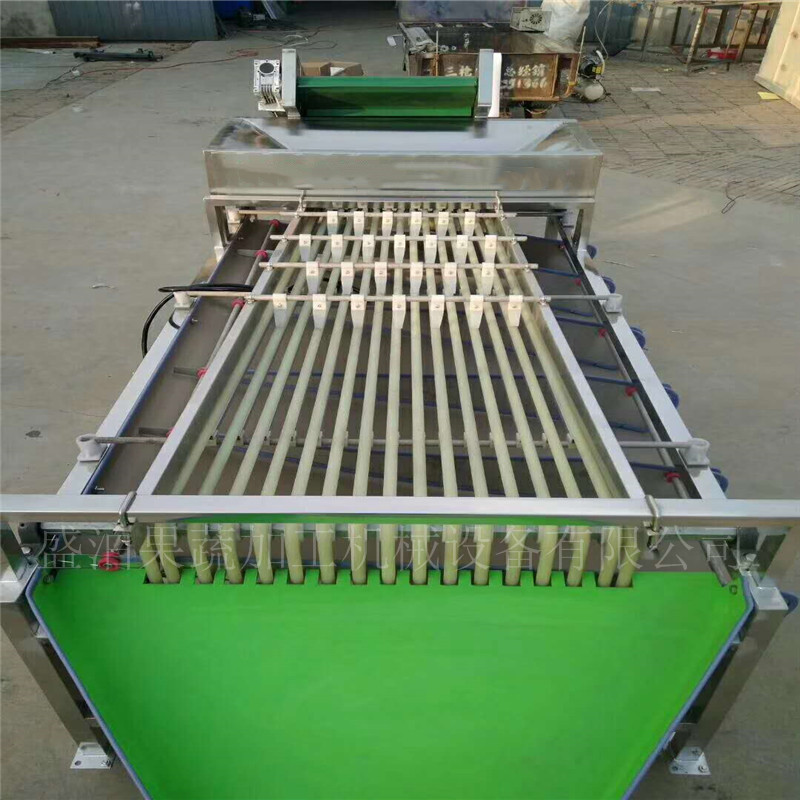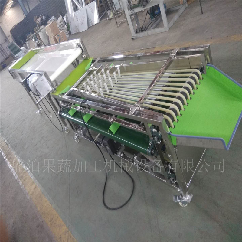 分级机工作原理:将果品倒入提升机内输送至轨道上面,由小到大顺序适当的孔径落入接料槽体,由倒料口排出,从而完成大小多种规格均匀分开,分级孔径可调节。该设备由提升部分、轨道及框架三部分组成,该机主要是采用双层轨道之间的间隙达到分级的目的。当物料连续均匀进入双工位轨道链带,通过双层轨道,利用轨道之间的间隙达到以直径大小来分级的效果,并且可以通过调节轨道的导轨来调节双层滚框之间的间隙,从而达到分级尺寸的可调。该设备用于油茶果、大枣、核桃、杨梅、沙果、蘑菇、芦笋等圆型、椭圆型水果和蔬菜的分类整理。