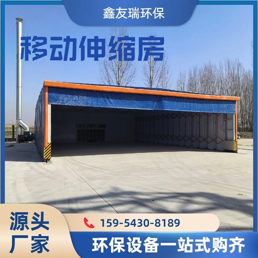 移动伸缩房是配备除尘设备及喷漆废气处理设备使用的一种大型环保设备。主要用于体积大、重量重的工件的喷漆和打磨。当待喷(打磨)的工件摆放好后,伸缩移动式的前室沿导轨运行,覆盖住工件后,即可停止前室的前进,工件进入到房内的工作区域,在喷漆或打磨过程中,工件周围会形成风幕,这时房内有载风速可达0.3m/s以上,使有害气体及粉尘不会在操作者呼吸带处停留,而随气流迅速向着后侧的漆雾及粉尘处理部分流动,在排风机的作用下,气流通过过滤器,漆雾或粉尘绝大部分被过滤器所过滤,少量剩余漆雾被漆雾过滤棉过滤掉,后几乎不含漆雾及粉尘的空气进入排风机被排风机经排风管道向排风道,留到车间外。